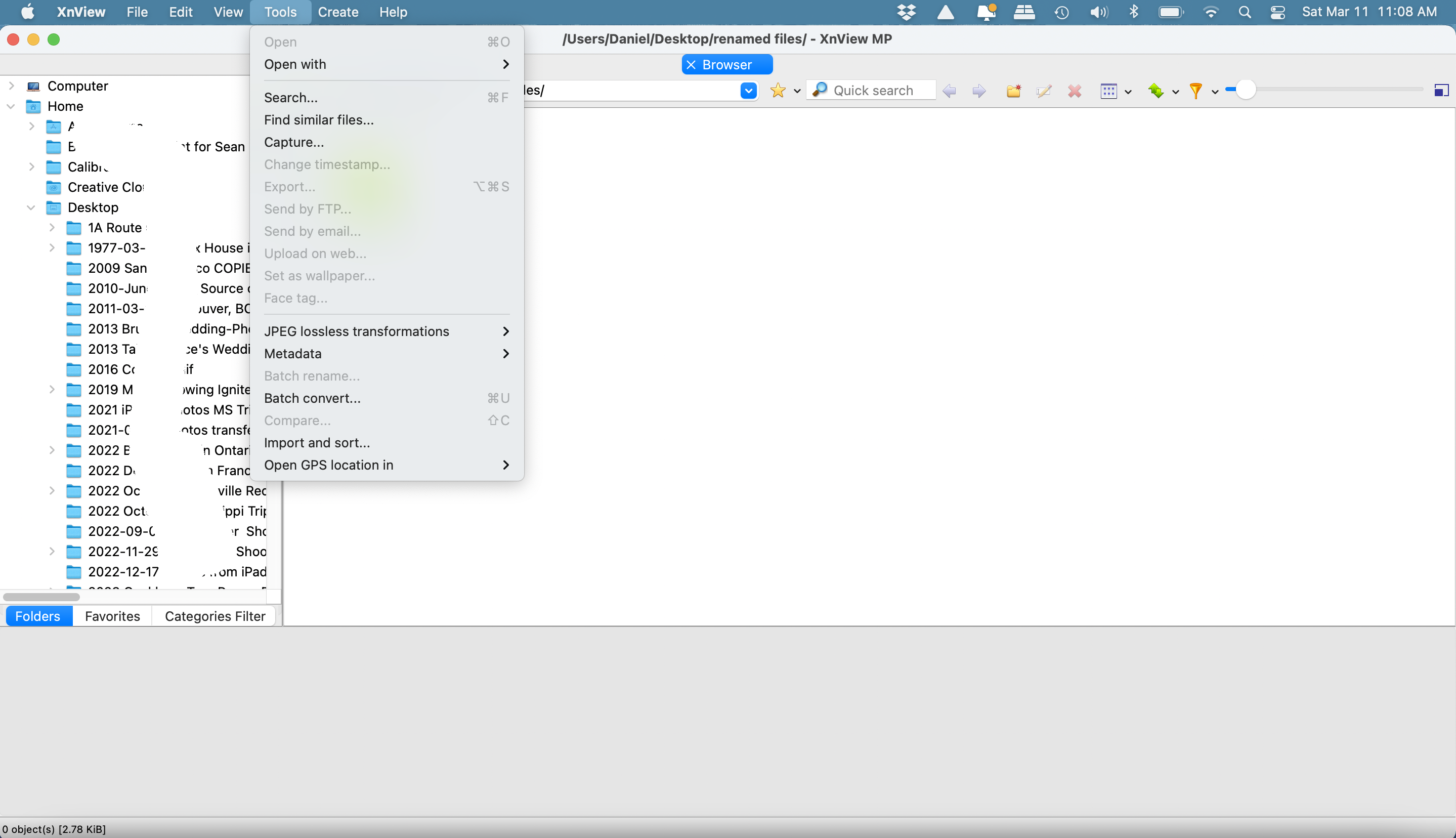 I go to a folder on my Mac. I open it it. I select a photo, then OPEN WITH... XnView.I get what you see in Photo 01. Then I press ESC expecting to see the entire contents of the folder that this photo sits in. Instead I get what you see in Photo 02. At that point the only think I can do is close XnView, as you see in Photo 3. Thank you.