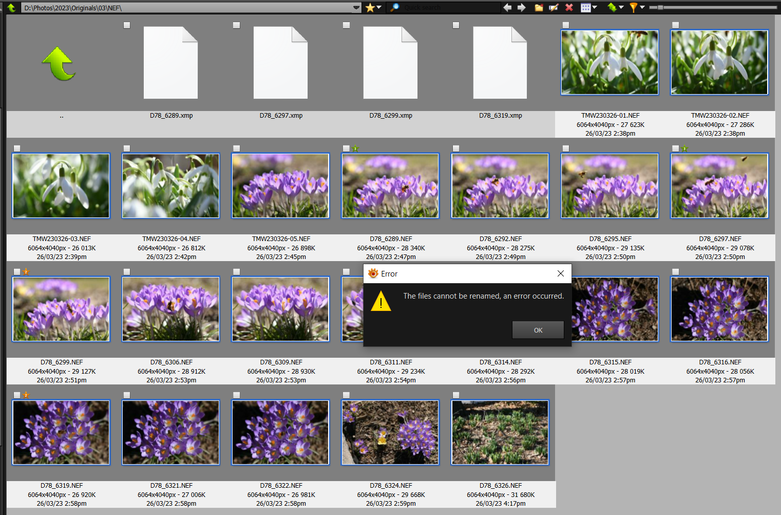 If I select a group of files to rename and some of them have an xmp sidecar (created when labelling in XnView), I get an error and cannot rename the files. If I select a smaller group of files that have no sidecar files, then they rename without any problems. See screenshot. I'm using XnView MP 1.4.3 64-bit.