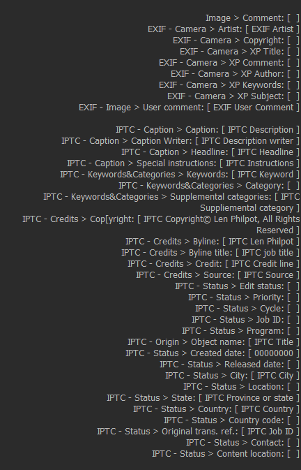 EXIF - Camera > Copyright: [ {EXIF:Copyright} ]