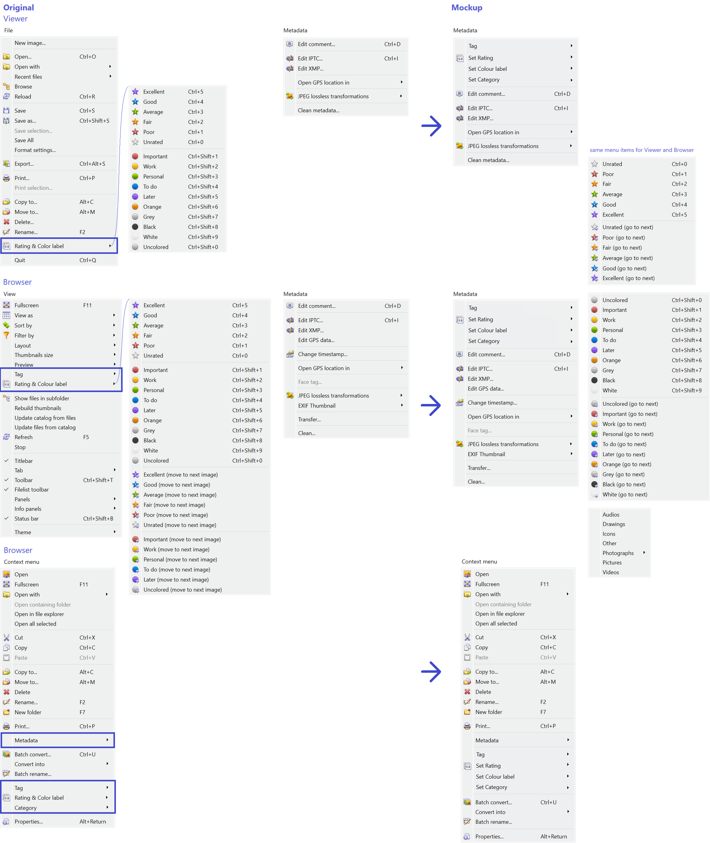 - Tag, Rating, Label, Category stuff is spread across different app's menus in different modes, which is inconvenient