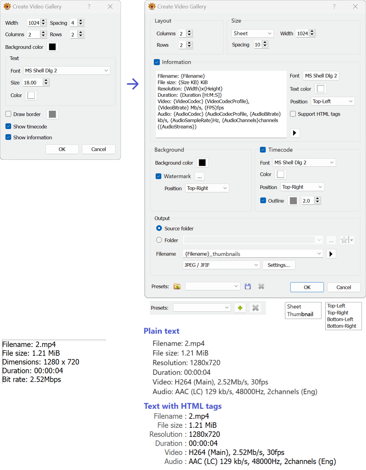 Filename: {Filename} File size: {Size KB} KiB Resolution: {Width}x{Height} Duration: {Duration [H:M:S]} Video: {VideoCodec} (VideoCodecProfile), {VideoBitrate} Mb/s, {FPS}fps Audio: {AudioCodec} (AudioCodecProfile, {AudioBitrate} kb/s, {AudioSampleRate}Hz, {AudioChannels}channels ({AudioStreams})