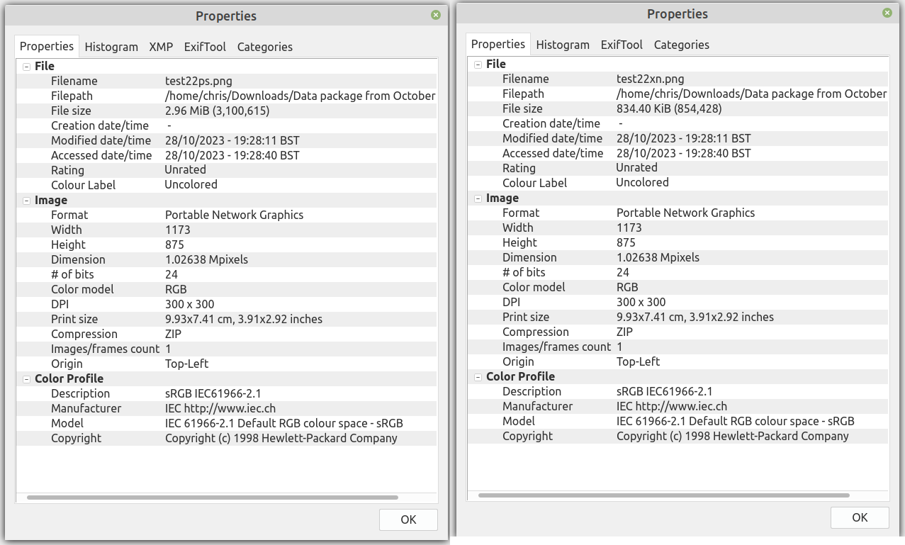 TweakPNG and PNG file chunk inspector agree that the iTXt chunk in test22ps.png (which contains the XMP metadata) is only 17'356 bytes in size.cday wrote: Sat Oct 28, 2023 7:05 pmDeleting the PS file XMP metadata reduces the file size to 847KiB, almost identical to the size of the XN file.