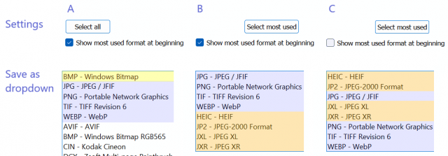 combinations of buttons (Select all/Select most used) and 'Show most used format at begining' checkbox