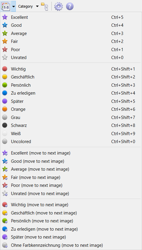If I change the language in ToolsSettings…General from English to Deutsch or Deutsch to English and restart XnView, the commands in the toolbar drop-down menu for Rating & Colour label are a mix of both languages.