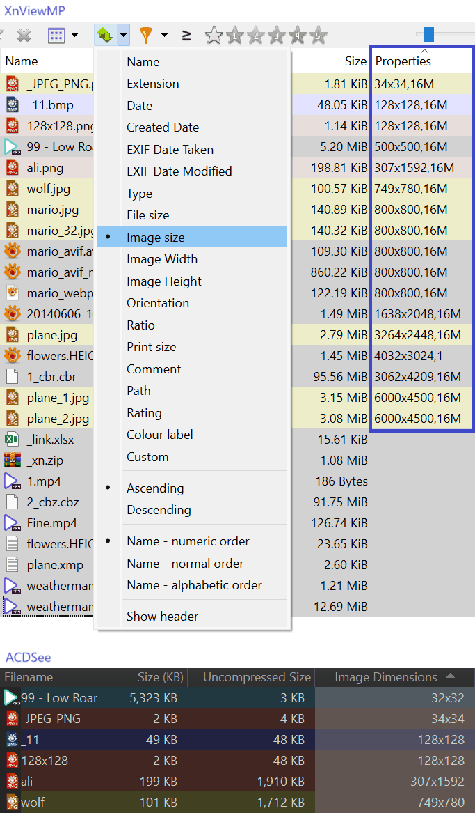 Windows have some "dimensions" sorting that sort images looking at their width and height and it is super handy in folders with a lot of files to find duplicates or similar images but either the "image size" and "ratio" of xnview give me different sorting results than windows.