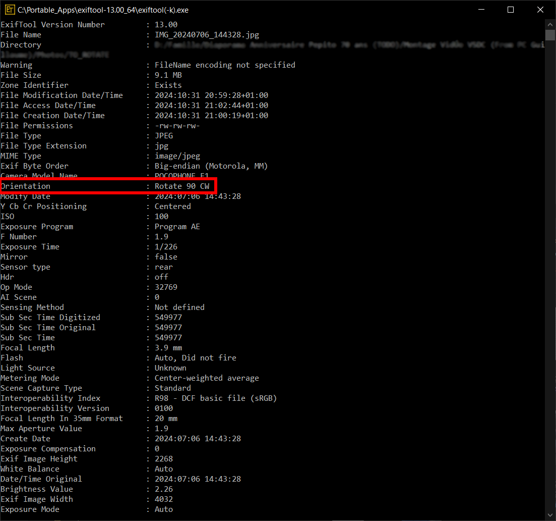 I have checked with the EXIF Tool "exiftool.exe" that display well a 90° CW rotation.