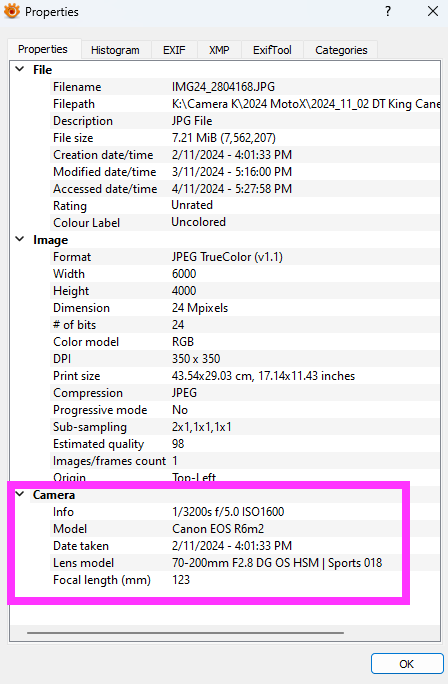 Now on the latest version, that information has all changed and the information I was most interested in has gone. Missing from the Properties tab underneath the File and Image sections there used to be a "Camera" section (see attached screenshots) that had Info (exposure shutter speed, aperture, and ISO). Model (of camera, Date taken, Lens model and Focal length, but all of those are now missing.