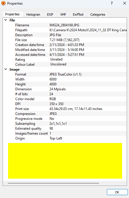 Until I upgraded XnView to v1.8.2 whenever I was viewing or previewing a photo and used the keystroke [Alt] + {Enter] a popup Properties window would appear that contained all the basic information about the image, with a great summary on the first tab.