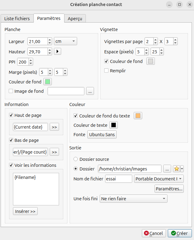 J'ai essayé avec 2*3 vignettes par page et 70 photos. Puis j'ai aussi essayé avec 5 photos... Toujours des pages blanches. voir les réglages en pièce jointe