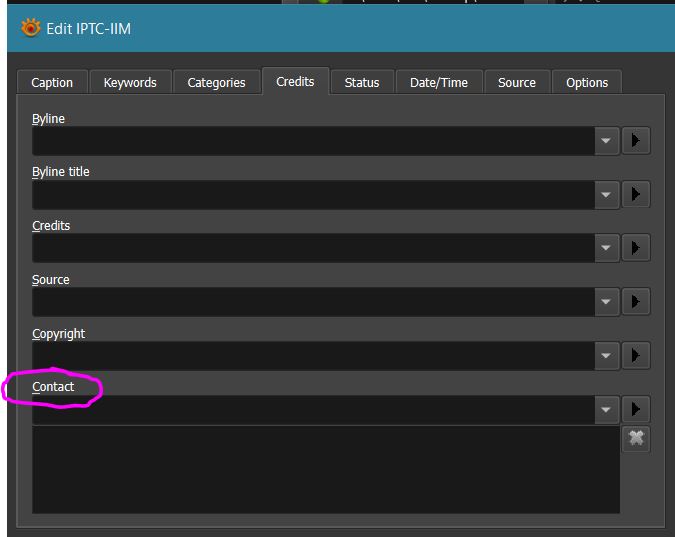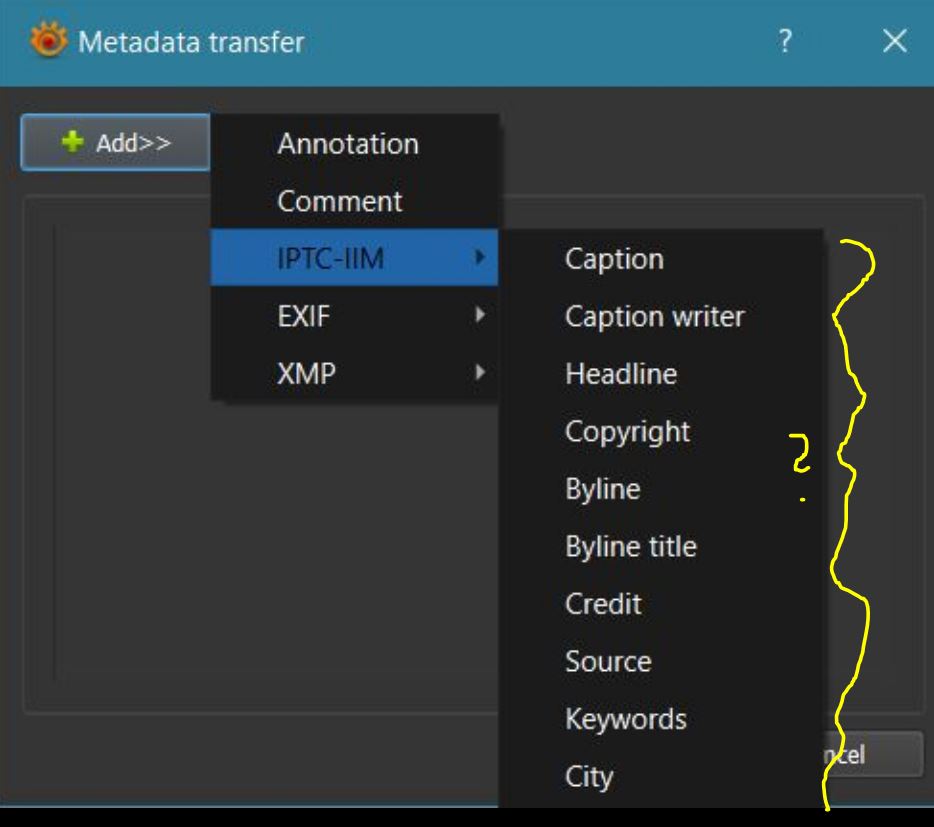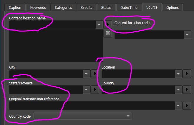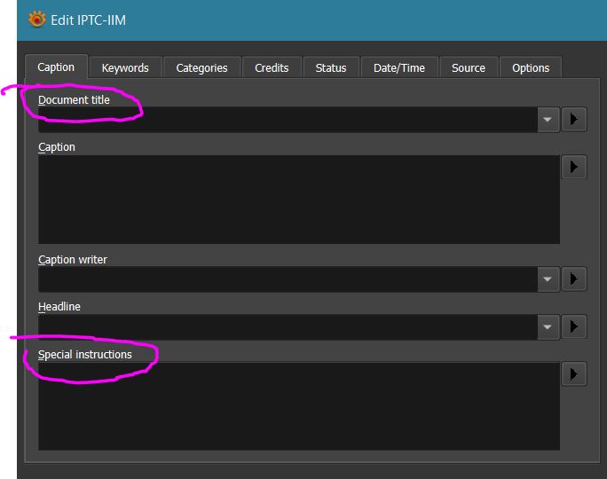 to add the missing fields (pink marked) to the TRANSFER (IPTC-IIM) Dialog